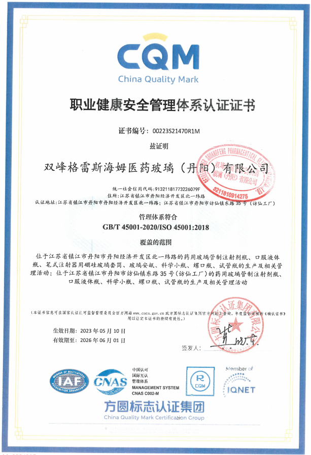 职业健康安全管理体系认证证书