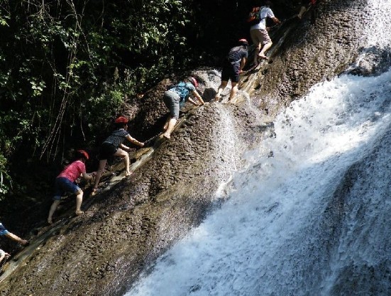 古东瀑布是以地下涌泉汇集形成的多级串连瀑布,瀑布比漓江水位还高