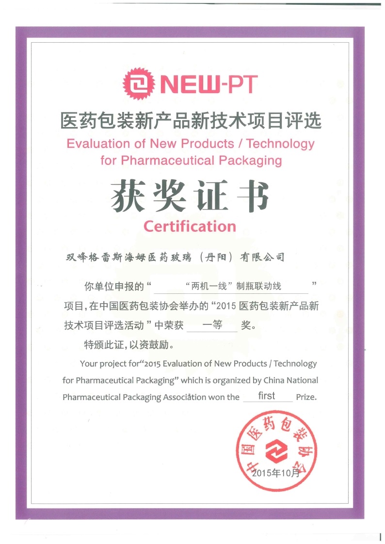 双峰格雷斯海姆医药玻璃(丹阳)有限公司荣获“2015医药包装新产品新技术项目评选活动”一等奖