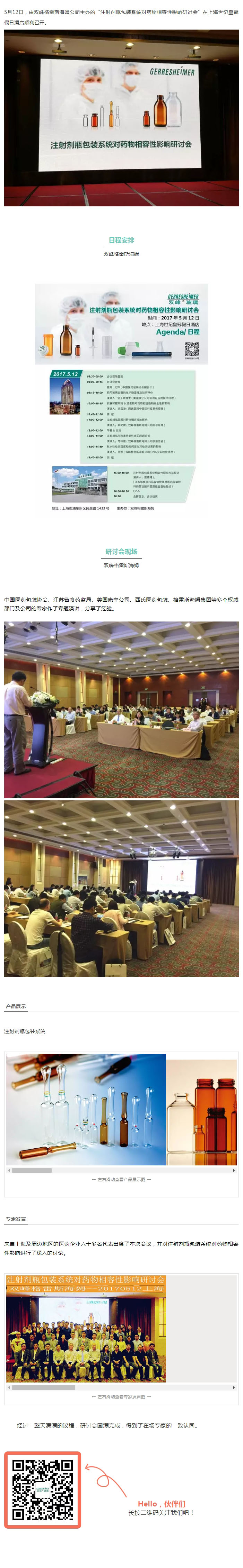 5月12日,由双峰格雷斯海姆公司主办的“注射剂瓶包装系统对药物相容性影响研讨会”在上海世纪皇冠假日酒店顺利召开。