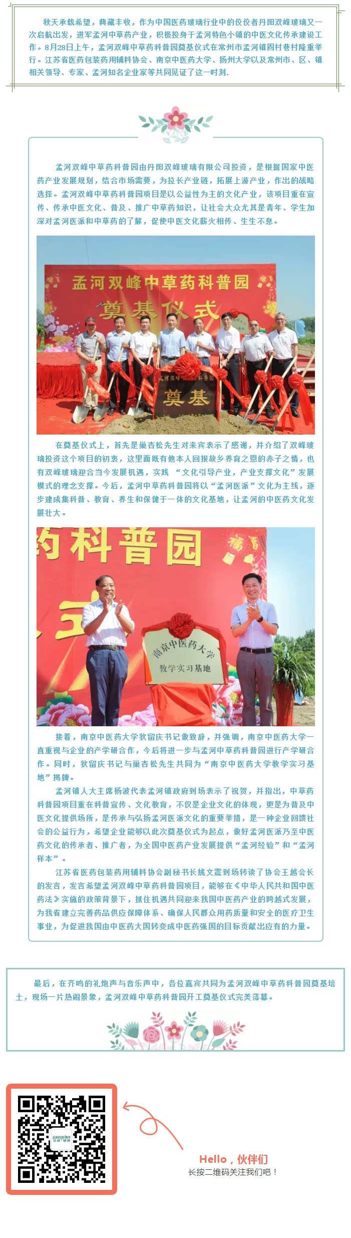 秋天承载希望,典藏丰收,作为中国医药玻璃行业中的佼佼者丹阳双峰玻璃又一次启航出发,进军孟河中草药产业,积极投身于孟河特色小镇的中医文化传承建设工作。8月28日上午,孟河双峰中草药科普园奠基仪式在常州市孟河镇固村巷村隆重举行。江苏省医药包装药用辅料协会、南京中医药大学、扬州大学以及常州市、区、镇相关领导、专家、孟河知名企业家等共同见证了这一时刻.